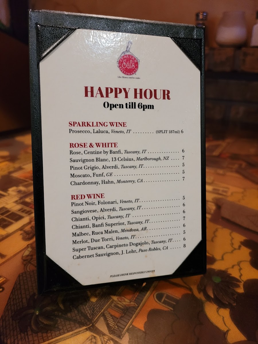 Sal's has a consistently good formula across its dozen or so locations, so wherever you are, you can have a nice Italian meal at a decent price. The location in Delray Beach has plenty of booths and a warm, welcoming feel. When we arrived at 6:00 for dinner, we noticed the place was pretty full. Most of the diners were finishing up their "early bird" dinner, which is quite popular. The server was attentive although she seemed a bit harried and was very busy. She offered us a choice of plain rolls, garlic rolls or both. Yes, please (to both)! Sal's rolls are delightful, with a nice crust and a light flaky dough. Beware though: the garlic rolls are very garlicy. Entrees come with a choice of soup or salad. Though the soup of the day, tomato florentine, sounded good, we opted for Sal's standard: pasta fagioli. It was full of pasta, beans and veggies. It was delicious but it did taste a bit salty. My wife had chicken parmesan, which she declared to be very good. It had a tasty sauce and the portion size was on the larger side. The chicken was quite tender. The only issue was that the entree, especially the pasta, was not very hot. I had the chicken marsala, which I enjoyed. The sauce was excellent and the mushrooms appeared to be fresh. As with the chicken parm, there was plenty of chicken marsala and pasta for a second meal. Bring on the doggie bags. For dessert, we had a chocolate chip cannoli and a panna cotta, which is a custard with strawberry sauce and blueberries. Buono! Is Sal's the best Italian restaurant around? Maybe not, but it is generally good and worth visiting.